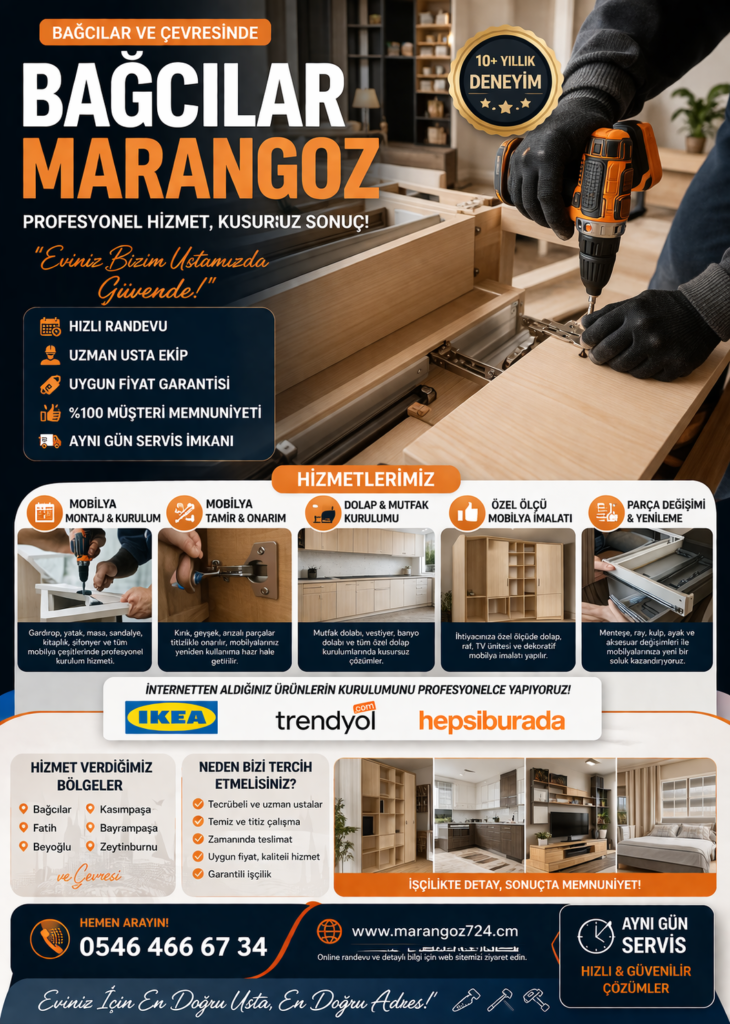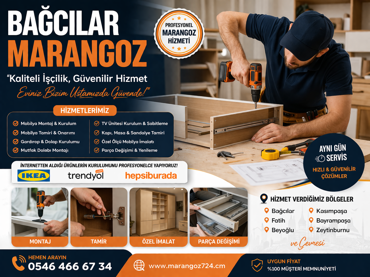 Bağcılar Marangoz Profesyonel Mobilya Montaj, Tamir ve Özel İmalat Hizmetleriİstanbul’un en yoğun ve hareketli bölgelerinden biri olan Bağcılar’da kaliteli, hızlı ve güvenilir marangoz hizmeti bulmak artık çok daha kolay. Bağcılar marangoz hizmetleri kapsamında sunduğumuz profesyonel çözümler ile evinizde, ofisinizde veya iş yerinizde ihtiyaç duyduğunuz tüm mobilya işlemlerini titizlikle gerçekleştiriyoruz. Yılların verdiği tecrübe, müşteri memnuniyeti odaklı çalışma anlayışı ve uygun fiyat politikamız ile Bağcılar ve çevresinde fark yaratıyoruz.